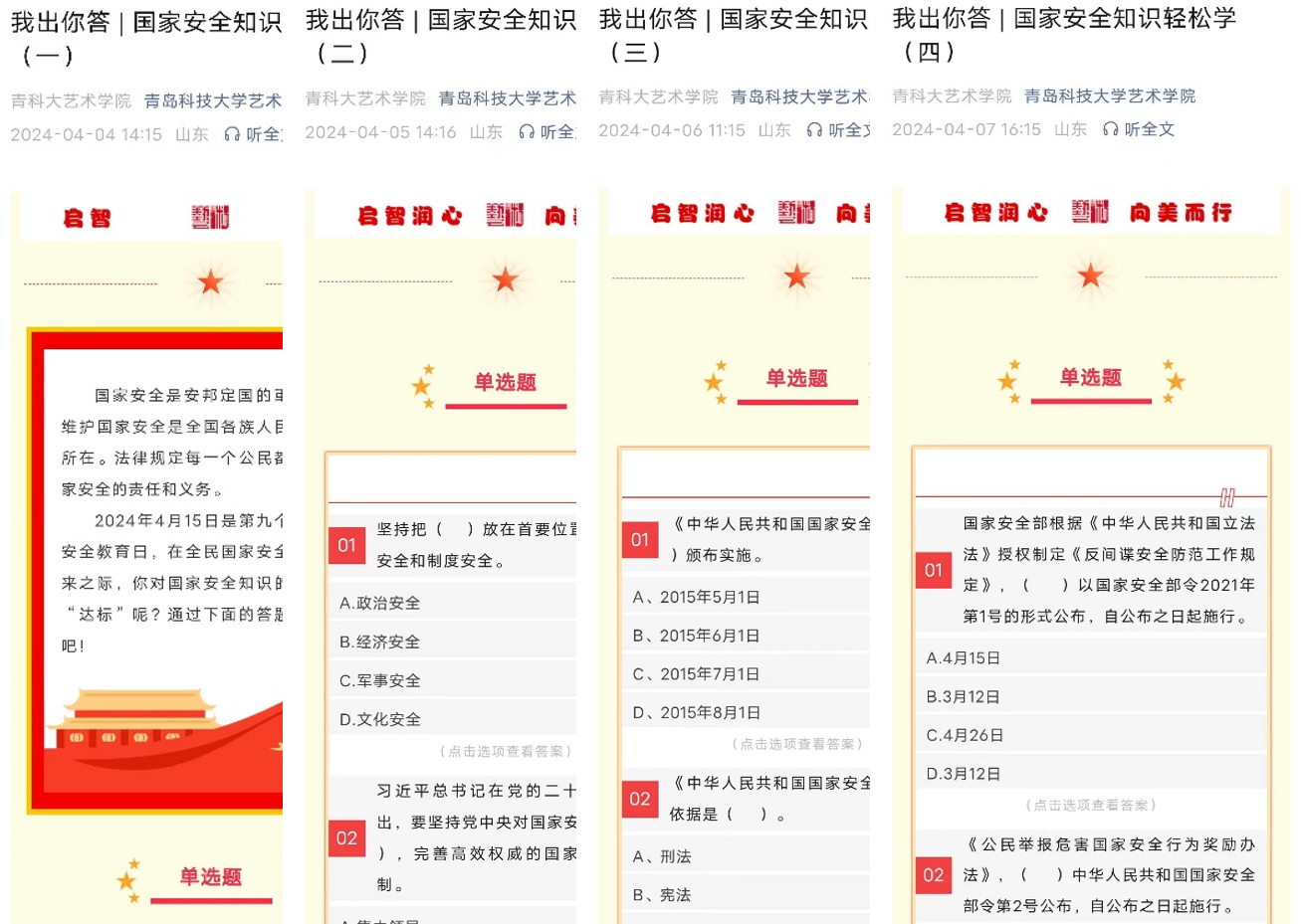将国家安全知识作为进行国家安全教育的重要抓手,通过单选题、多选题、判断题等多种考察模式精心设置每一期的学习内容,确保兼顾学习内容的广度和深度。除此之外,各团支部为进一步加强支部青年学生对于国家安全宣传的认识,发起了“国安标语青年说”特色活动,青年学生在国家安全宣传语思考的过程中,进一步深化自身维护国家安全主人翁角色意识。