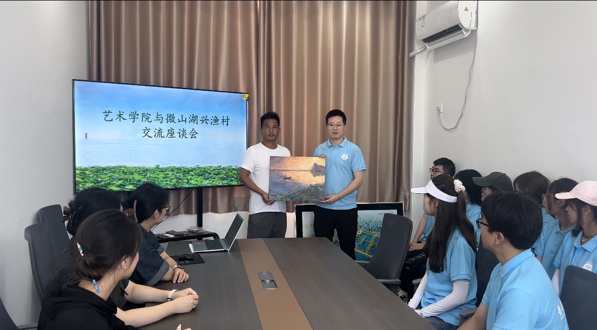 和实践团成员的基本情况,并组织队员就化书记提出的问题进行讨论,实践队队员从艺术专业的角度出发依次发言,提出相应的解决举措。座谈会最后,实践队为湖兴渔村赠送了队员们创作的诗画艺术作品。
