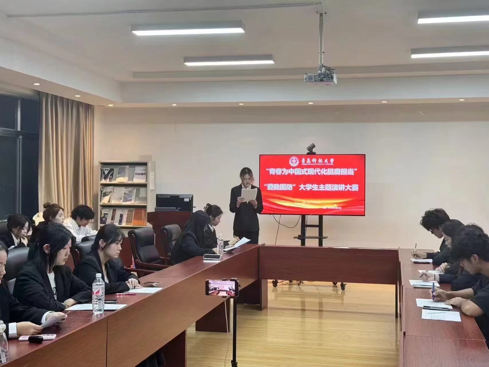 活动现场,气氛热烈而庄重。同学们满怀深情,用激昂澎湃的语调朗诵着一篇篇经典之作。台上,同学们或抑扬顿挫,或婉转悠扬,配合着的肢体语言与背景音乐,仿佛将观众们带回到了那个波澜壮阔的革命年代。观众们沉浸其中,被同学们真挚的情感所打动,不时报以热烈的掌声。评委们则专注聆听,从朗诵内容、表达技巧、情感传递、仪态仪表等多个方面进行的打分。