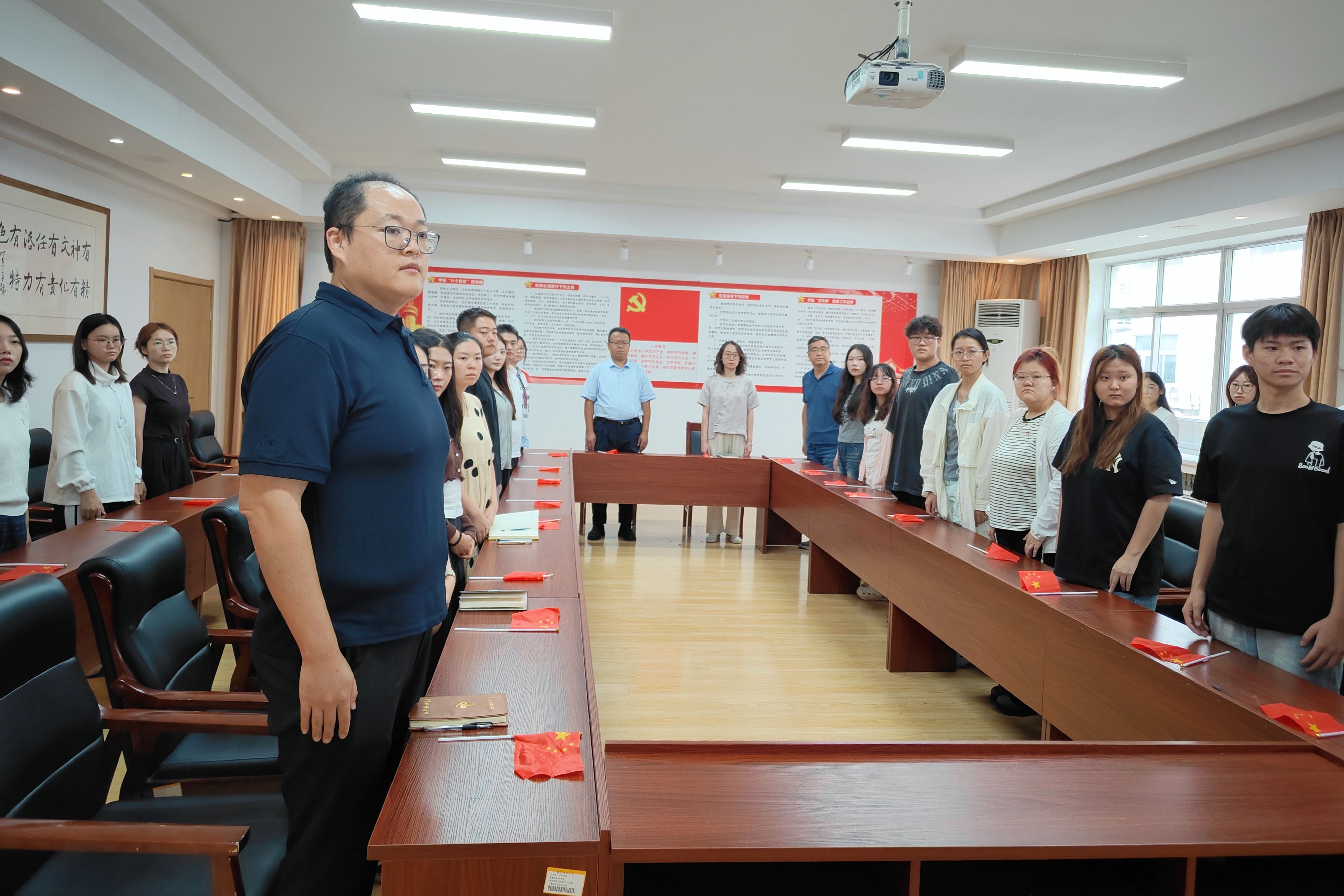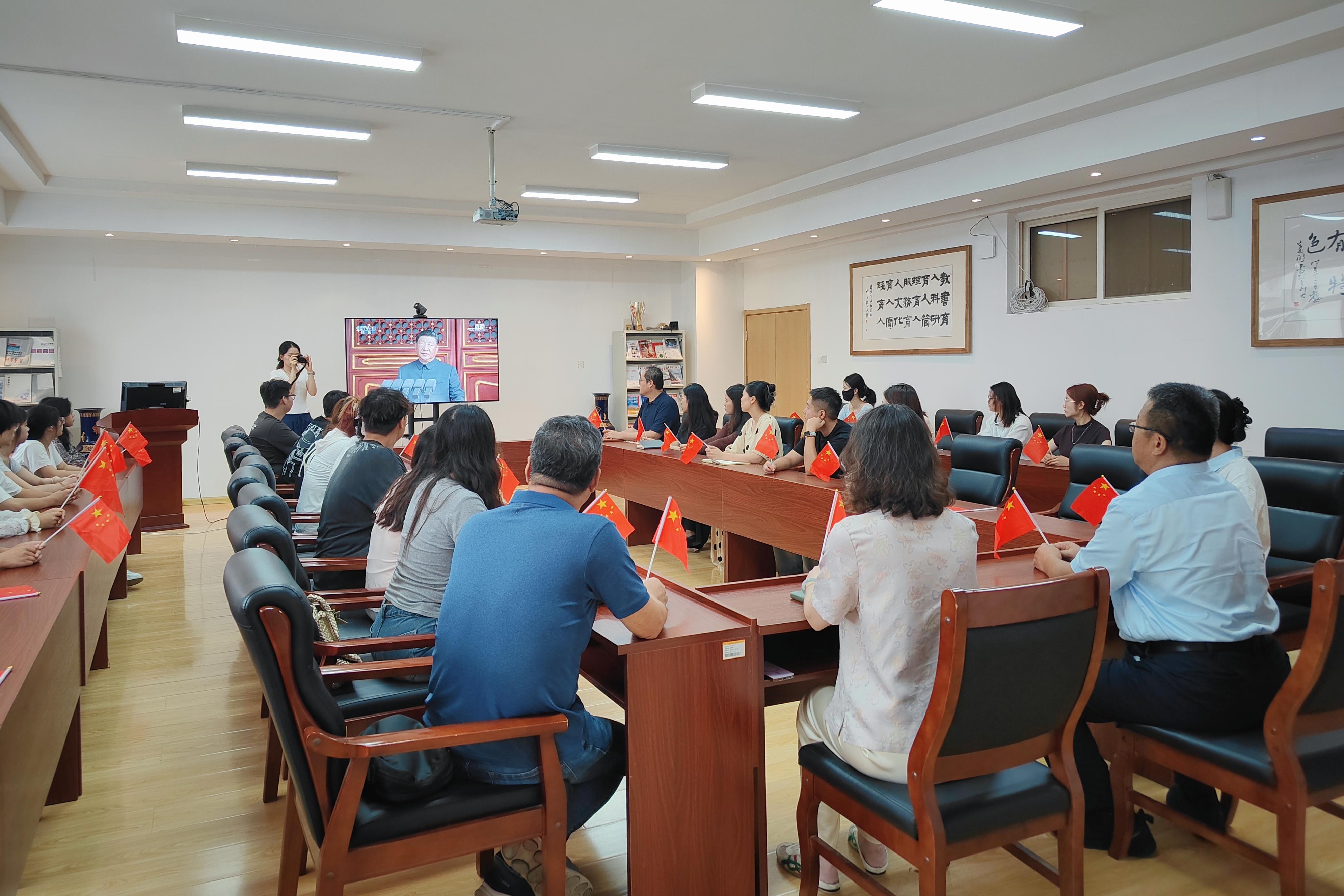 党委书记刘庆的带领下,师生代表在213会议室集中观看九三阅兵直播,共同见证这一庄严震撼的历史时刻。