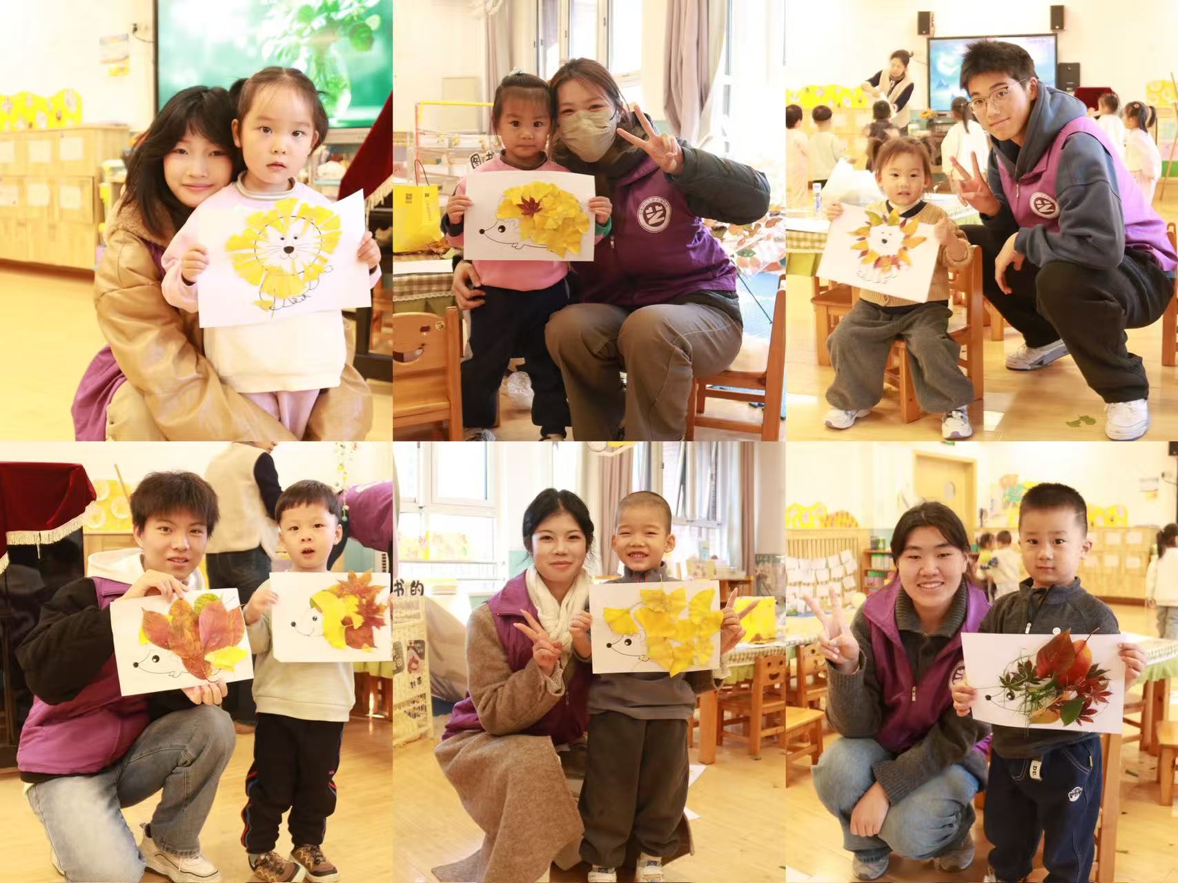 活动现场洋溢着温暖而专注的氛围,志愿者们手把手引导小朋友们兴致勃勃地修剪、拼贴落叶,每一片叶子的摆放都凝聚着孩子们的想象与期待。孩子们眼中闪烁着好奇与喜悦的光芒,有的拼出神气又可爱的小狮子,有的组合成圆滚滚的小刺猬,整间教室充满了亲切的互动与阵阵清脆的笑声。经过近两小时的投入创作,一件件充满想象力、流露童真童趣的落叶手工作品温馨“出炉”。活动最后,志愿者与小朋友手持作品合影,一张张灿烂的笑容定格了这段温暖而有意义的时光。志愿者们专注而亲切的陪伴,赢得了幼儿园老师与孩子们的一致认可。