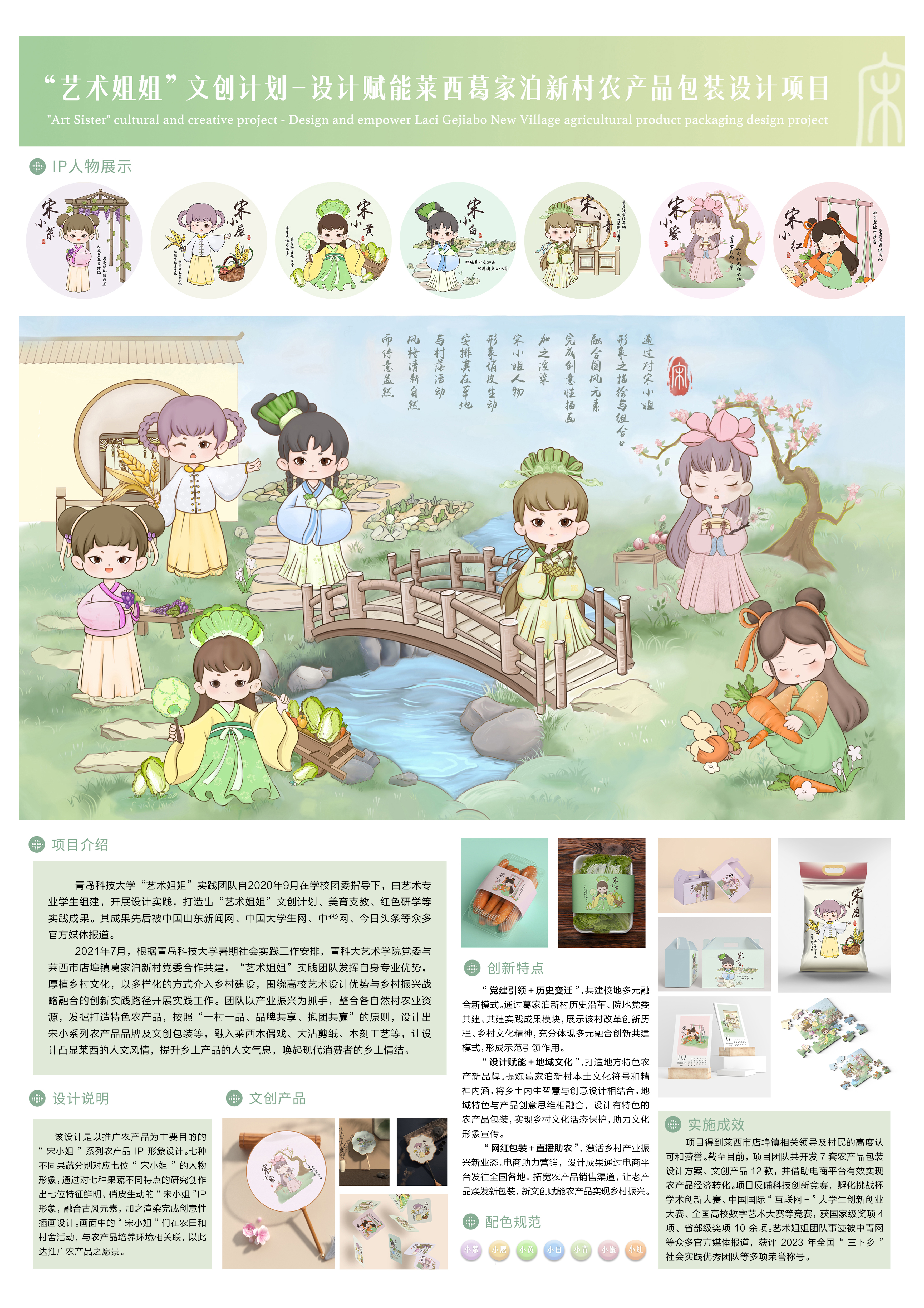 “艺术姐姐”实践团队自2020年9月成立以来,相继打造出“艺术姐姐”文创计划、美育支教、红色研学等社会实践成果。七星彩开奖直播 党委与莱西市店埠镇葛家泊新村党委合作共建后,实践团队发挥自身专业优势,厚植乡村文化,以多样化的方式介入乡村建设,围绕高校艺术设计优势与乡村振兴战略融合的创新实践路径开展实践工作。团队以产业振兴为抓手,整合各自然村农业资源,发掘打造特色农产品,设计农产品品牌及文创包装。“‘艺术姐姐’文创设计——设计赋能莱西葛家泊新村农产品包装设计项目”是学校“艺术姐姐”社会实践队在乡村实践过程中主动服务乡村振兴战略所需、立足莱西葛家泊新村实际催生的社会实践成果。