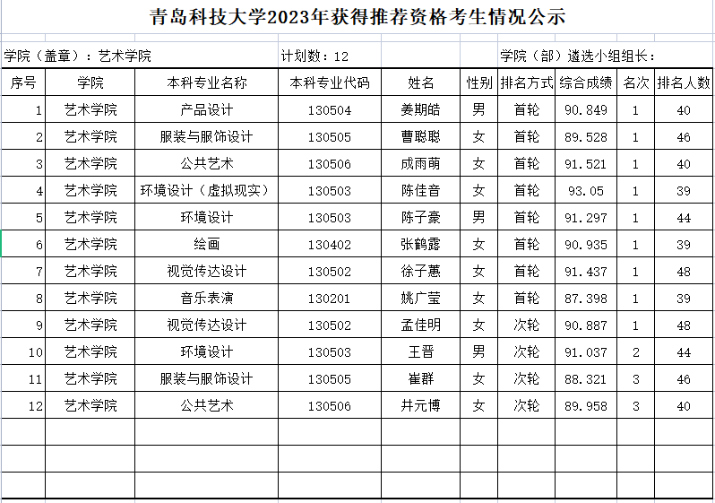 《青岛科技大学2023 年推荐优秀应届本科毕业生免试攻读硕士学位研究生工作方案》和《七星彩开奖直播 2023 年推荐优秀应届本科毕业生免试攻读硕士学根据位研究生遴选办法》等文件规定,七星彩开奖直播 完成了2023年推荐优秀应届本科毕业生免试攻读硕士学位研究生的遴选工作,现对推荐人员(名单附后)进行公示。