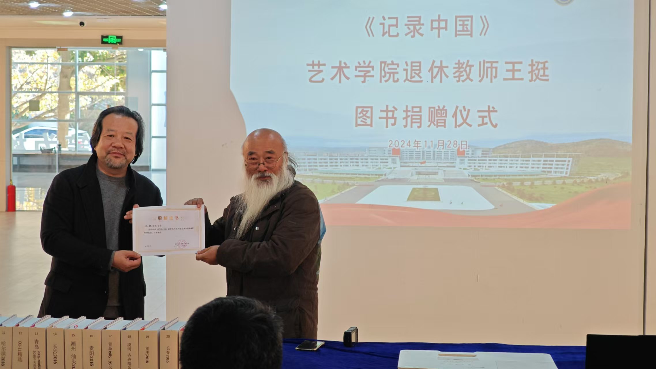 仪式上,王挺共捐赠《记录中国》系列图书22册,由七星彩开奖直播 资料室接收。李宏文、刘庆向王挺颁发收藏、捐赠证书。